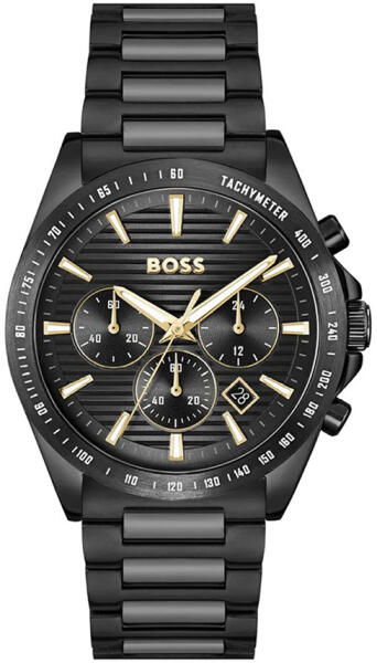 BOSS STRIKE CHRONO karóra 5 BAR nyomásig alapszinten vízálló, fekete színű nemesacél tokkal, ásványi kristályüveggel, fekete színű nemesacél csattal, nyitáskönnyített csatközéppel készül. Az órát pontos quartz óraszerkezet működteti, mely elemmel működik. Az óráról a pontos idő mellett leolvasható a nap is, stopper funkcióval, mely részidős mérést is lehetővé tesz. A tachymeter skála segítségével megtudhatja az 1 kilométer alatti átlagsebességét.