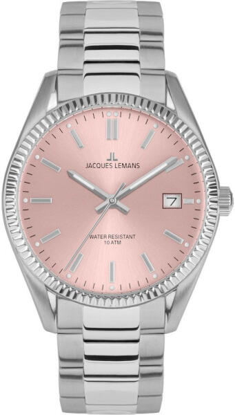 Rózsaszín "sunburst" hatású számlap, dátum kijelzéssel.