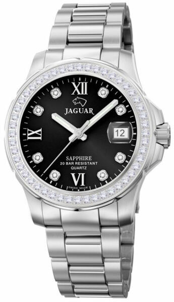 Márka: JAGUAR | Kollekció: WOMAN | Modell: J892/4 | Garancia: 2 évek | Szín: fekete | Szín: ezüst | Tok színe: ezüst árnyalat | Tok anyaga: nemesacél | Táplálás: elem | Szíj anyaga: nemesacél | Funkciók: Dátum – a hónap napja | Vízálloság: 200M/20ATM | Üveg: zafír | Forma: kerek | Számjegyek a számlapon: római | Számjegyek a számlapon: indexek | Rendeltetés: női | Termék típusa: karórák | Típus: analóg | Szíj szélessége: 16,9 | Átmérő: 34,5