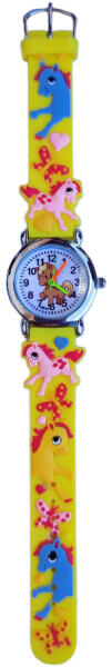 Unikornis mintás gyerek karóra citromsárga szilikon szíjjal, kvarc óraművel és analóg kijelzővel.