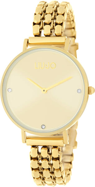 A Liu. Jo teljes aranyozott kivitelezésű női karóra felkelti a figyelmét az elegáns, eredeti és tiszta kivitelezésével. A champagne árnyalatú számlapot csak három kő díszíti díszíti az indexek és az aranyozott, márkanévvel ellátott mutatók helyén.