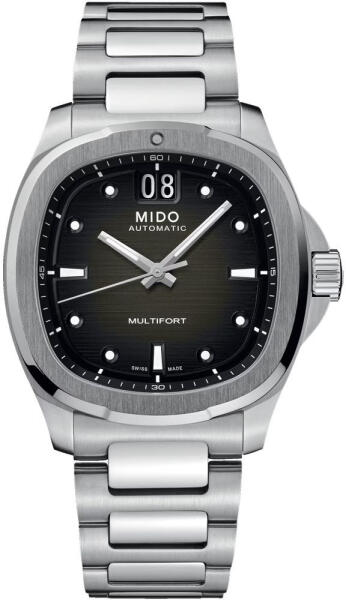 A Mido Multifort TV Big Date férfi karóra M049.526. 11.081. 00 karóra házának anyaga Nemesacél, színe Ezüst, a szíjának anyaga Nemesacél és a színe Ezüst. Az óratok átmérője 40 mm, alakja Kerek. A karóra üvege Zafír (karcolásmentes), szerkezete Automata és vízállósága 10 atm (100m) (úszásra is alkalmas).