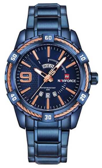Acél szíjas Naviforce férfi karóra, kék rozsdamentes acél szíjjal, kék színű tokozással, dátum és nap kijelzéssel, utánvilágítós. TULAJDONSÁGOKrozsdamentes acél tok és szíj, stabil szerkezettel dátum és nap kijelzés ásványi kristályüveg Japán szerkezet vízállóság: 30 M - Bővebb információMÉRETEKház szélessége: 4,6 cm ház magassága: 1,2 cm szíj hossza: 24,5 cm szíj szélessége: 2,2 cm