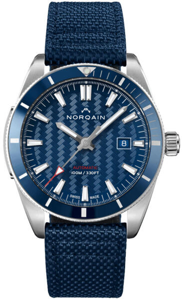 A Norqain Adventure Sport 42mm férfi karóra N1000.08S02. A01. F01 karóra házának anyaga nemesacél, színe ezüst, a szíjának anyaga szövet és a színe kék. Az óratok átmérője 42 mm, alakja kerek. A karóra üvege zafír (karcolásmentes), szerkezete automata és vízállósága 10 atm (100m) (úszásra is alkalmas).