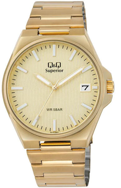 Q&Q férfi karóra, arany színű nemesacél tok, arany színű foszforeszkálós számlap, arany színű nemesacél csat S21A-006PY (4216-4)