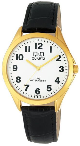 Q&Q férfi karóra, quartz, arany színű fémtok, fekete bőrszíj, fehér arab számos számlap, C192J104Y (4267-7)