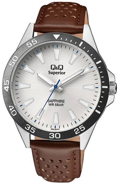 Q&Q férfi karóra, quartz, ezüst színű acél tok, ezüst színű számlap, barna színű bőrszíj, (Superior), zafír üveges, S08A-007PY (4096-7)
