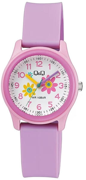 Q&Q gyerek karóra, quartz, rózsaszínű műanyag tok, fehér színű virágos számlap, lila színű műanyag szíj, VS59J004Y (4086-8)