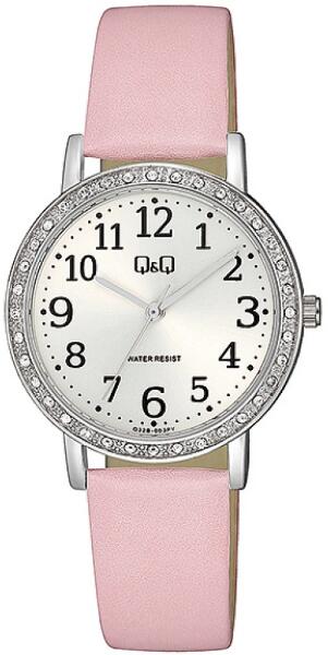 Q&Q női karóra, ezüst színű fémtok kődíszítéssel, rózsaszín bőrszíj, ezüst színű számlap, Q32B-003PY (4206-1)