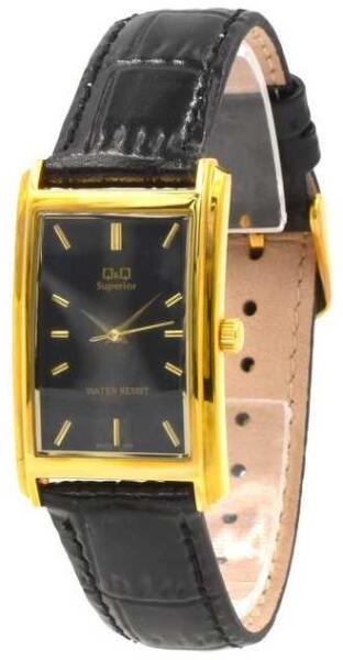Fekete bőr szíjas, arany tokozású, fekete számlapos, elegáns, téglalap alakú, Q&Q Superior karóra, díszdobozban.  Mindennapi használatra, elegáns öltözethez. TULAJDONSÁGOKbőrszíj ásványi üveg Japán myota quartz szerkezet díszdobozbanMÉRETEKház szélessége: 2,4 cm x 3,2 cm ház magassága: 0,7 cm szíj hossza: 23 cm szíj szélessége: 1,6 cm