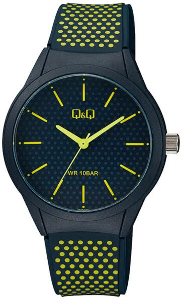 Q&Q unisex karóra, quartz, s. kék színű műanyag tok, s. kék színű számlap, s. kék színű műanyag szíj citromsárga színű pöttyökkel, VR28J035Y (4217-2)