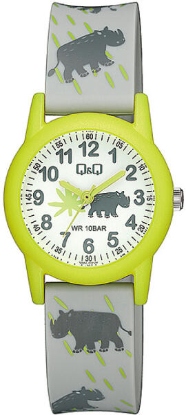 Q&Q gyerek karóra, quartz, zöld színű műanyag tok, fehér színű számlap, szürke színű műanyag szíj, V22A-017VY (4085-7)