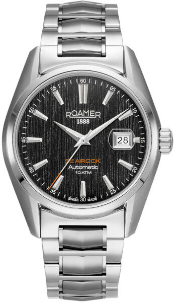 A Roamer Searock Master automata 10 ATM vízállóságát a masszív tok, a menetes üveg hátlap és a koronazár garantálja, úszáshoz, fürdéshez, vízi sportokhoz bátran használhatjuk. A tükröződésmentes zafírkristály borítás alatt a számlapon kard alakú, jól polírozott óra- és percmutatók, piros hegyű másodpercmutató és nagyító dátumablak található. Az óra indexei és a mutatók fluoreszkálnak, így sötétben is leolvashatóak.