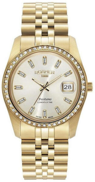 gyártó:RoamerModellNr :853858 48 39 20 Positanoehemalige Listaár:*:389,00 Euroszámlap:analóg, szín: aranyTechnik:svájci ÓraszerkezetHáz:Rozsdamentes acél tok goldfarben, előlap cirkónia kirakott, , átmérő : ca. 3,4 cm, vastagság: ca. 0,9 cm, Súly: ca. 100 GrammÓralap:rozsdamentes acél ház Herstellerlogo, karkötő:goldfarbenes karkötő összecsukható csattal