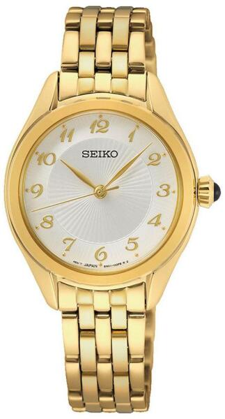 Seiko Classic - SUR384P1 típusú női karóra. Az óra kijelzése analóg, hagyományos mutatók jelzik az idő múlását. Elemmel működő kvarc szerkezet nagy pontossággal biztosítja az energia ellátást a működéshez. Az óra pontos és precíz járásáért a Seiko saját fejlesztésű 6N01 szerkezete gondoskodik. Az óra vízállósága 50 Méter mélységig, vagy 5 Bar uralkodó nyomásértékig garantált. A csat rész nemesacélból készült. Seiko óra rendelésnél minden esetben ingyenes a szállítás. Minden Seiko óra eredeti termék. A karóra mellé hivatalos Magyar garanciát, és számlát biztosítunk. A megrendeléseket szinte azonnal kezeljük, és akár már másnapra ki is szállítjuk. Garantált pénzvisszafizetés mellett, extra kiemelt 3 - 4 év garanciát adunk. A termék megvásárlása esetén Ön élhet a 14 napos elállás vagy a 30 napos csere jogával. Magyarországon már 30 éve értékesítünk Seiko órákat.