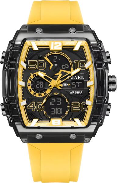 A SMAEL EM-38668 sportos férfi karóra sárga-fekete kombinációban egyedi dizájnt kínál analóg és digitális kijelzővel.