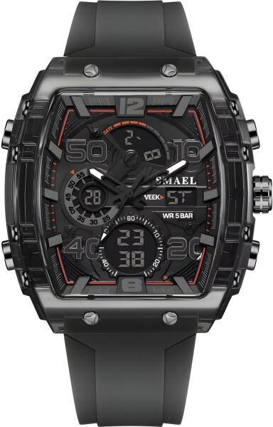 A SMAEL EM-38672 sportos férfi karóra elegáns tiszta fekete kialakításban modern és mutatós dizájnt kínál analóg és digitális kijelzővel.