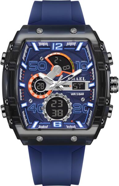 A SMAEL EM-38673 sportos férfi karóra kék-fekete kombinációbanmodern dizájnt kínál analóg és digitális kijelzővel.