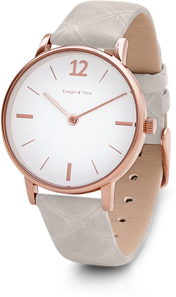 Karóra bőr szíjjal Szín: Ház: rózsaarany. Szíj: szürke Anyag: Ház: rozsdamentes acél és üveg. Szíj: 100% krómmentesen cserzett bőr Méretek: Számlap Ø: kb. 34 mm. Ház magassága: kb. 8,1 mm. Szíj hossza: kb. 21 cm, szélessége: kb. 16 mm NemesacélKrómmentesen cserzett bőrből készült szíjSzíj nyomott mintávalKarcálló ásványüveg