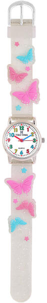 TIKO TIME karóra gyerekeknek, ezüst színű fémtok, quartz szerkezet, fehér arab színű számlap, 3D figurás áttetsző csillámos műanyag szíj, cseppmentes vízállóság (lepkés) (7474-0)