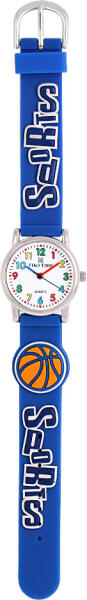TIKO TIME karóra gyerekeknek, ezüst színű fémtok, quartz szerkezet, fehér arab színű számlap, 3D figurás kék színű műanyag szíj, cseppmentes vízállóság (kosárlabdás) (7471-5)