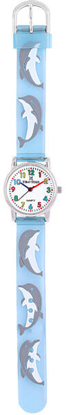 TIKO TIME karóra gyerekeknek, ezüst színű fémtok, quartz szerkezet, fehér arab színű számlap, 3D figurás kékes áttetsző műanyag szíj, cseppmentes vízállóság (delfines) (7473-9)