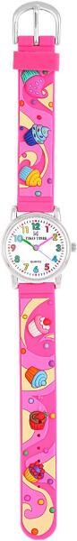 TIKO TIME karóra gyerekeknek, ezüst színű fémtok, quartz szerkezet, fehér arab színű számlap, 3D figurás rózsaszín műanyag szíj, cseppmentes vízállóság (sütis) (7472-3)