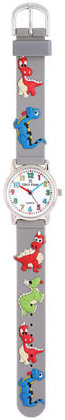 TIKO TIME karóra gyerekeknek, ezüst színű fémtok, quartz szerkezet, fehér arab színű számlap, 3D figurás szürke színű műanyag szíj, cseppmentes vízállóság (dínós) (7474-1)