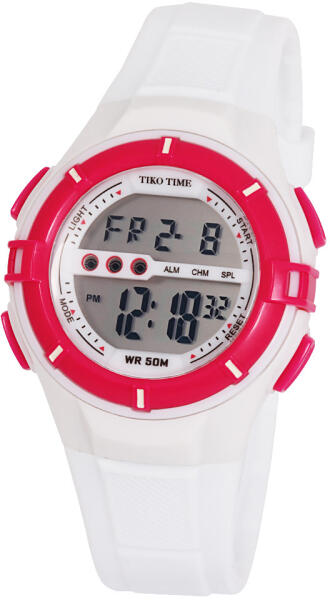 TIKO TIME női műanyag karóra, quartz, fehér és ciklámen színű tok és csat, LCD számlap (7455-9)