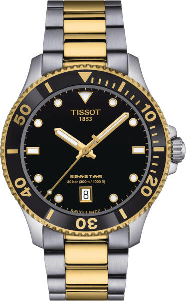 Tissot T120.410. 22.051. 00 Férfi Karóra – Seastar 1000 40mm A Tissot Seastar 1000 Quartz 40mm modell a svájci óragyártás precizitását és a sportos eleganciát egyesíti egy letisztult, modern kivitelben. Ez a két tónusú, acél–arany PVD bevonatú változat a víz alatti kalandokhoz és a mindennapi viselethez egyaránt tökéletes választás. A 40 mm-es 316L rozsdamentes acél tok sárga arany PVD szegéllyel és fekete, egyirányban forgatható búvár lünettával rendelkezik, amely megbízható időmérést biztosít a merülések során. A fekete számlapon Super-LumiNova® bevonattal ellátott mutatók és indexek találhatók, amelyek kiváló leolvashatóságot garantálnak még gyenge fényviszonyok között is. A karcálló zafírkristály dupla oldali antireflexiós bevonattal készült, így mindig tiszta és torzításmentes látványt nyújt. A csavaros korona és hátlap, valamint a 30 bar (300 m) vízállóság a Seastar sorozatra jellemző extrém strapabíróságot biztosítja. A modell svájci quartz szerkezettel működik, EOL (End of Life) funkcióval, amely jelzi az elem élettartamának végét. A kétszínű acél–arany PVD szíj biztonsági nyomógombos, hajtókás zárral van ellátva, és gyorskioldós rendszerének köszönhetően egyszerűen cserélhető. A Tissot Seastar 1000 40mm nemcsak technikai teljesítményével, hanem elegáns megjelenésével is kiemelkedik. Főbb jellemzők: