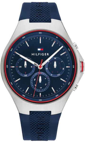 Ez egy Tommy Hilfiger márkájú, 1792057 típus számú, Justin férfi karóra. A tokjának anyaga nemesacél, a szíja szilikonból készült. Az óratok mérete 44 mm, üvege kristály és vízállósága 50 m. Az óra quartz szerkezettel ellátott. analóg szerkezet