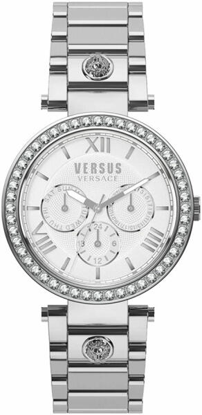 gyártó: Versus ModellNr : VSPCA4021 (Camden Market) ehemalige Listaár:*: 250,00 Euro számlap: Analoganze ige, szín: fehér Versus by Versace Logo és silberfarbigen Zeiger / index Ház: Rozsdamentes acél tok silberfarben, előlap Kristallen verziert, átmérő ca. 38 mm, magasság:ca. 9 mm Óralap: Rozsdamentes acél a gyártó logójával karkötő: mi nőségi karkötő
