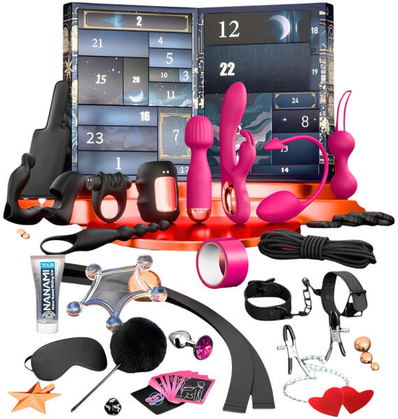 Viszonylag nagy méretű (35,5 cm X 27,5 cm X 10,5 cm), papírból készült, fakkokkal ellátott adventi kalendárium, amiben természetesen 24 fiókocska van. Mindegyikben egy kisebb-nagyobb hasznos szexjátékszert, vagy kiegészítőt találunk. Vannak benne egészen apró kiegészítők, mint síkosító, szemmaszk, vagy cirógató, de komolyabb, vibrációs örömszerzőket is találunk benne. A naptárban található termékek összértéket számolva mindenképpen figyelemreméltó ajánlat, a gyártó 600 eurós (kb. 230-240 ezer forint) értékről ír, amit mi azért túlzónak tartunk. Mivel ennél a terméknél nem tudjuk kibontani és alaposan megvizsgálni a benne lévő eszközöket, ezért a Szeresdmagad. hu-ra egyébként nem jellemző módon most kivételesen, nem az általunk készített, hanem a gyártó termékleírását olvashatja az alábbiakban. Lovecherry Adventi Naptár 2025 – 24 napnyi pajkos meglepetés Az idei karácsony nemcsak a forralt bor és a fényfüzérek miatt lesz varázslatos… hanem mert minden napra jut egy kis titkos öröm!Minden kis ablakocska egy új kalandot rejt. A változatos tipográfia játékos hangulatot kölcsönöz, a belső elrendezés pedig annyira igényes, hogy már a kibontás is előjáték... És ami a legfontosabb: a 24 csomagban minőségi örömszerző játékszerek lapulnak, amelyek új érzéseket ébresztenek, fokozzák a hangulatot, és minden napot egy kicsit pikánsabbá varázsolnak. A naptárban összesen 24 játék és kiegészítő kapott helyet, íme a tartalom: Nanami vízbázisú síkosító (50 ml): Tökéletes vízbázisú síkosító, amely biztonságos, kényelmes és rendkívül kellemes élményt nyújt. Teljesen szagtalan és színtelen, nem ragadós, masszázshoz és óvszerrel is használható. Cirógató: Amellyel partnere testének bármely részét kényeztetheti, felerősítve az érzékeket. Szexkocka: Dobja el, és engedje szabadjára a spontaneitást. Minden oldal új pozíciót rejt a játékos és kalandos együttlétekhez. Ujjra húzható vibrációs örömszerző: Egy kivehető, kis mérető töltényvibrátorral felszerelve, akkumulátoros, 10 rezgési funkcióval. Használhatja masszázshoz, szóló, vagy páros játékhoz. Gésagolyó: Szilikonból készült, 50 g súlyú intim tréner az erősebb, intenzívebb orgazmusokért. Kézi masszírozó: Segít ellazulni egy hosszú nap után, vagy érzékiséget ad az előjátékhoz. Bilincs: Puha, biztonságos bilincs az irányítás és alávetettség izgalmainak felfedezéséhez. Análplug kristállyal: Alumíniumból készült, lekerekített véggel a könnyű behelyezéshez és kristállyal díszített talprésszel a biztonságos használatért és csábításért. Szemmaszk: Érzékek felerősítésére, a cirógatóval kombinálva még izgalmasabb. Vibrációs péniszgyűrű: A töltényvibrátorral kombinálva intenzívebb szexuális élményt ad. Prosztatavibrátor: Szintén a töltényvibrátorral használható, ideális a P-pont stimulálására. Nyuszis vibrátor: Klitoriszággal is ellátott szilikon borítású vibrátor, 10 rezgési móddal, vízálló, akkumulátoros. Kártyajáték: Játékos, pajzán kártyák, amelyek fokozzák a szenvedélyt. Szemkötők: Lágy tapintású, ideális az érzékek felfokozásához. Bondage szalag: Nem ragad a bőrhöz, vagy a hajhoz, tökéletes kötözős játékokhoz. Vibrációs anál gyöngysor: A töltényvibrátorral használható, fokozatosan növekvő méretű kialakítással. Péniszgyűrű szett: 4 db szilikon péniszgyűrű, különböző méretekben, erősebb erekcióhoz. Mellbimbótakarók: Szív alakú, öntapadó takarók, titokzatos és csábító megjelenéshez. Mellbimbócsipeszek lánccal: Állítható nyomású klasszikus csipeszek, lánccal összekötve. Vibrációs maszturbátor: Férfi maszturbátor, 10 rezgési funkcióval, vízálló és akkumulátoros. Bondage kötél: 5 méter hosszú, puha, de erős kötél kreatív kötözéshez. Paskoló: Puha és tartós anyagból. Mini masszírozó gép: Szilikonból készült, 10 rezgési funkcióval, akkumulátoros és vízálló. Vibrációs tojás: Akkumulátoros, 9 rezgési funkcióval, hosszú szilikon farkincával.