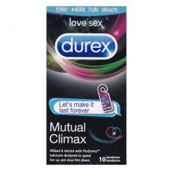 A termék megegyezik a Durex Mutual Pleasure termékkel, csak más a neve és kicsit a csomagolás, ez a kivitel az Angol piacra készült. A Durex Mutulal Climax óvszerek különleges síkosítója segít a férfiaknak a csúcspont késleltetésében és az együttlét elnyújtásában. Az intenzívebb stimulációt az óvszer bordázott és pontszerűen érdesített felülete segíti elő. A Durex Mutual Pleasure egy különleges síkosítót - benzokaint - tartalmaz az óvszer belső felületén, amely segít a férfinak a csúcspont késleltetésében és az izgalom elnyújtásában... ezzel meghosszabbítva a szexuális együttlétet. Figyelmeztetés: az óvszerhez használt síkosító kiütéseket, irritációt, égető érzést vagy viszketést okozhat. Ne nyúlj a szemedhez, és használat után mosd le! Ha irritációt észlelsz, ne használd tovább az óvszert! Ha nem javul az állapotod, fordulj orvoshoz! Ne használd ezt az óvszert, ha neked vagy partnerednek sérült vagy gyulladt a bőre. Ha az óvszer használata közben valamelyikőtöknek légzési nehézségei akadnak vagy szája elkékül, azonnal hagyjátok abba a használatát és hívjatok orvost! A Durex Mutual Pleasure óvszer különleges gyártási módjának köszönhetően kellemesebb illatú, így nem vonja el semmi a figyelmeteket, egyszerűen csak kapcsolódjatok ki és élvezzétek. A tökéletes biztonság érdekében a terméket tárold száraz, hűvös, napfénytől védett helyen. 10 db/csomag Névleges átmérő: 56 mm (a normál óvszerátmérő: 52-53 mm) Áttetsző, síkosított, ondótartállyal A síkosító 5% benzokaint tartalmaz Bordázott és pontszerűen érdesített felület Easy On forma a könnyebb felhúzásért és viselésért Magyar dobozos termék
