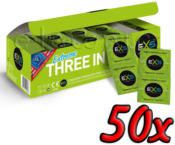 EXS Extreme 3 az 1-ben. Bordás, pontozott és peremmel ellátott óvszer.