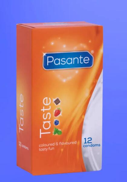 A Pasante ízesített és színezett óvszerai az ízletes szórakozás érdekében. Ízek közé tartozik a friss menta (zöld), az eper (piros), a csokoládé (barna) és az áfonya (kék).