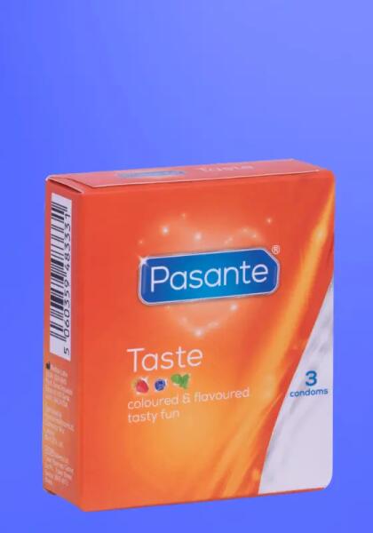 A Pasante ízesített és színezett óvszerei az ízletes szórakozás érdekében. Ízek közé tartozik a friss menta (zöld), az eper (piros), a csokoládé (barna) és az áfonya (kék).