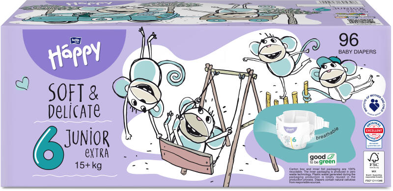 A Happy Soft & Delicate Junior Extra (6) 11-18 kg-os újszülöttek számára ajánlott. A legmagasabb minőségű anyagokból készülnek, tökéletesen alkalmazkodnak a baba testéhez, és kellemes, száraz érzést biztosítanak. Úgy tervezték, hogy megfeleljenek a legérzékenyebb bőr igényeinek - nem tartalmaznak allergéneket, és minimálisra csökkentik a pelenkakiütés kockázatát.