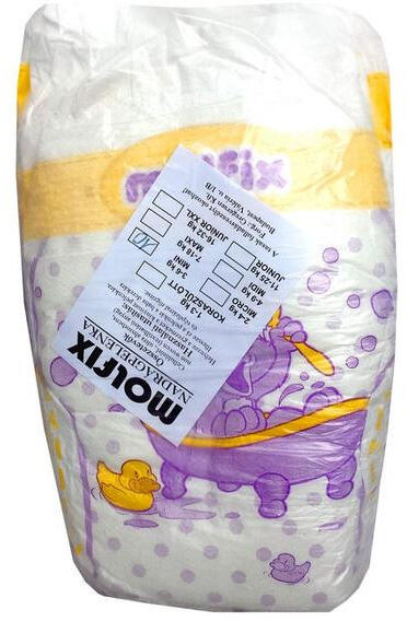 Kiszerelés: 16 csomag/gyűjtő. Prémium nadrágpelenka, széles gumírozott tépőzárral, Molfix mintával.