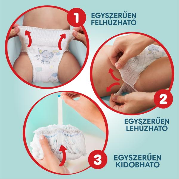 A rendkívül puha anyagokból készült pelenka a Pampers legpuhább bugyipelenkája, amely kényelmesen öleli körbe a kisbabát, 3 nedvességfelszívó csatornája pedig magába zárja a nedvességet, hogy a pici kizárólag a Pamperstől elvárható szárazságot érezhesse. Így többé semmi sem állhat játékos kisbabánk útjába. Rendkívül puha: a Pampers legpuhább bugyipelenkája, amely tollpihe-puhaságú anyagokból készült. Tökéletes illeszkedés: a rugalmas derék- és combgumírozás követi a kisbabánk mozgását, így minden helyzetben kényelmesen illeszkedik. 3 nedvességfelszívó csatorna: segít egyenletesen eloszlatni a nedvességet az akár 12 órán át tartó szárazságért. Légáteresztő anyagok: elvezetik a nedvességet, így segítenek azt távol tartani babócánk bőrétől. Micro Pearls mikrogyöngyök: felszívják és elzárják a nedvességet a babánk bőrétől. Körbeölelő illeszkedés: rugalmas derék- és combgumírozása igazodik a kisbabánk alakjához és mozdulataihoz, így minden helyzetben tökéletesen illeszkedik.