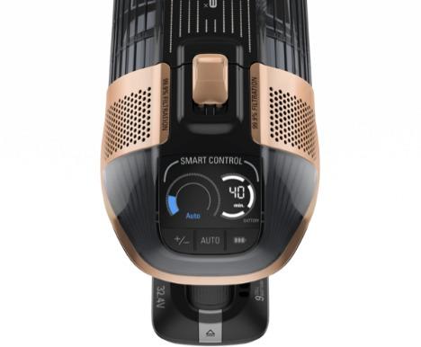 5 beállítás, köztük az automatikus sebesség, amely a teljesítményt a felület típusához igazítja. A kijelző valós időben mutatja a hátralévő üzemidőt, valamint figyelmeztet, ha a szűrőt ki kell cserélni.