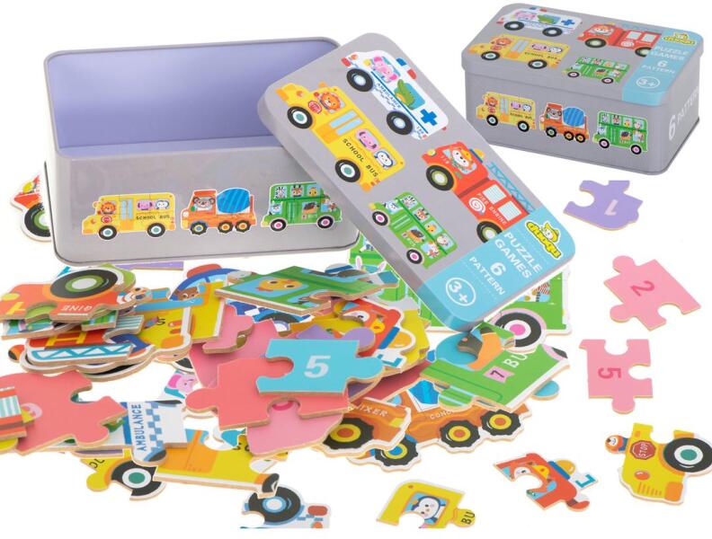Keverd meg a puzzle-t, és fordítsd meg őket képpel lefelé a padlón, majd hagyja gyermekét kibontakozni, ahogy összerakja a különböző járművek képeit. Játék közben a kisgyermek a memóriát, a logikus gondolkodást és a kézi készségeket gyakorolhatja. Nem foglalnak sok helyet, egy fémdoboz pedig megkönnyíti a tárolást és utazásra is magával viheti őket. Méretek: