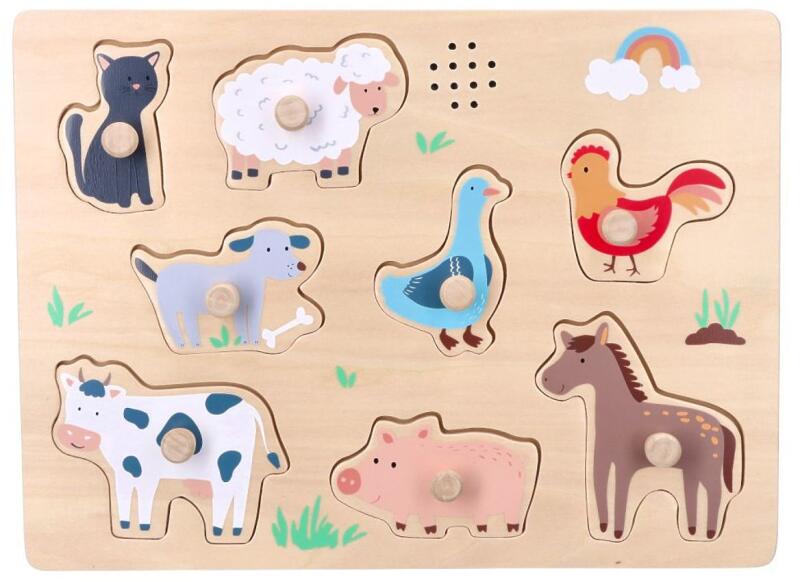 Hangos kínálat az Adam Toys márkától. A gyermek megismerkedik a tanyasi állatokkal, miközben a formáikat a puzzle megfelelő helyére illeszti. Ha helyesen helyezi el az állatokat, valósághű hangot hall, amelyet az adott állat ad ki. A kutya ugat, a macska nyávog, a ló nyerít stb. A puzzle természetes fából készült, egy alapból és 8 tanyasi állatból áll. Megtalálható benne: kutya, macska, ló, malac, tehén, bárány, kacsa és tyúk. A játék nagyszerűen fejleszti a gyermek képzelőerejét, tanítja a koncentrációt és a megfigyelőképességet. A gyermek manuális készségeit is gyakorolja, különösen az ujjait, és a hang további játékra ösztönzi.