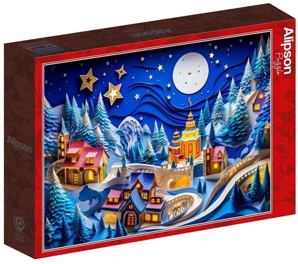 A havas éjszakát beragyogja a csillagok fénye és a házikók ablakából kiszűrődő fények. Az Alipson 1000 db-os puzzle - Winter Landscape (50274) képén egy papírkép szerű alkotás elevenedik meg, igazi ünnepi hangulatot teremtve.