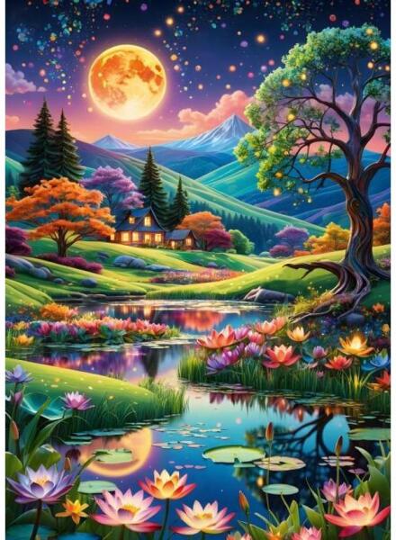 A telihold arany fénye bevilágítja a nyugodt éjszakát. A természet titokzatos és varázslatos arcát mutatja meg az Alipson 50172 - Full Moon Night - 500 db-os puzzle színes, fantáziadús képe.