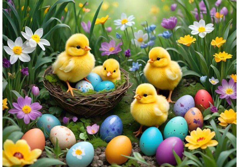 Aranyos kiscsibék, színes húsvéti tojások és tavaszi virágok kelnek életre az Alipson 50182 - Easter Chicks - 500 db-os kirakón . A kép vidám és üde atmoszférát teremt.