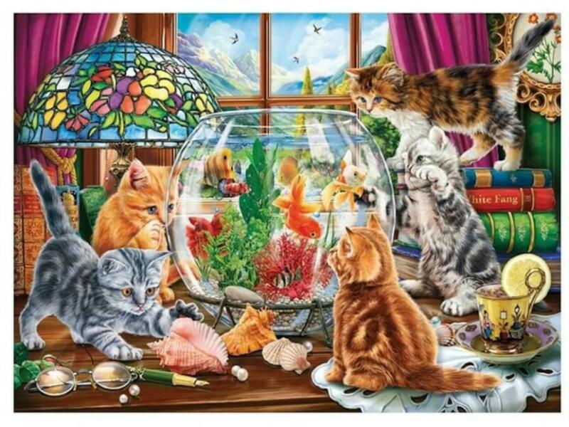 Az Anatolian 1000 db-os puzzle -Kittens and Aquarium (1142)  című képén játékos kiscicák és egy tündéri akvárium ábrázolása, mely tele van élettel és vidámsággal. A puzzle a cuki és szórakoztató jelenetek kedvelőinek tökéletes választás.
