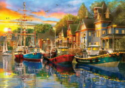 Az Anatolian 1500 db-os puzzle - Harbour Lights  című képén Dominic Davison alkotásában egy idilli kikötő jelenik meg, szép hajókkal, vízparti házakkal.