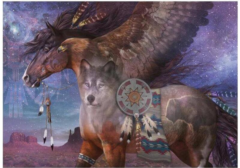 Misztikus jelenet spirituális motívumokkal, ahol a szellemi világ és a természet összeolvad. Az Anatolian 4569 - Spirit Guides - 1500 db-os puzzle  egy mély jelentéstartalmú, különleges atmoszférájú kirakó.