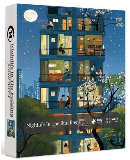 Éjszakai városi élet részletei elevenednek meg a Bboldin 1000 db-os puzzle - Nightlife In The Building (Z-1979) több emeletes épületében. Fedezd fel az izgalmas részleteket és kapcsolódj ki ezzel a kellemes hangulatú kirakóval!